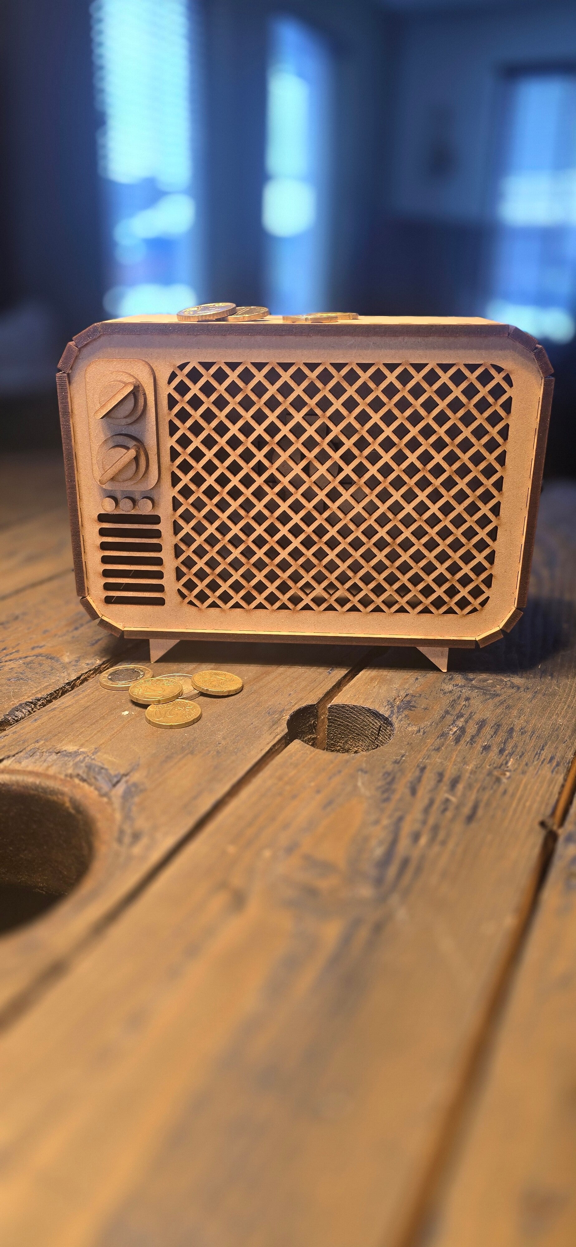 De spaarpot is 20 m breed. 15 cm hoog en gemaakt van 4 mm onbehandeld mdf.