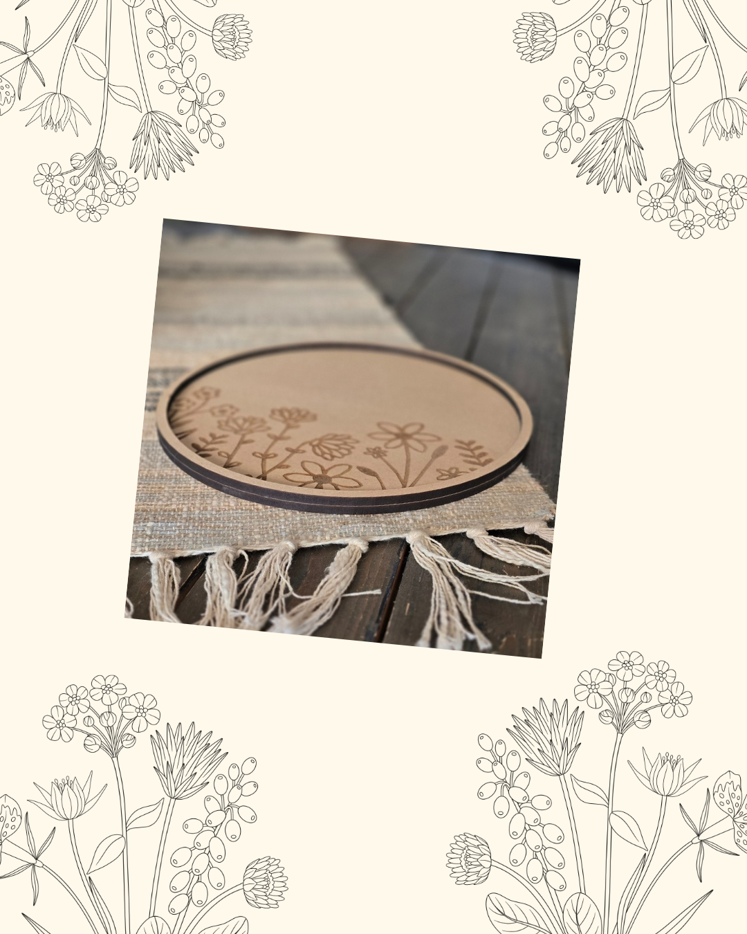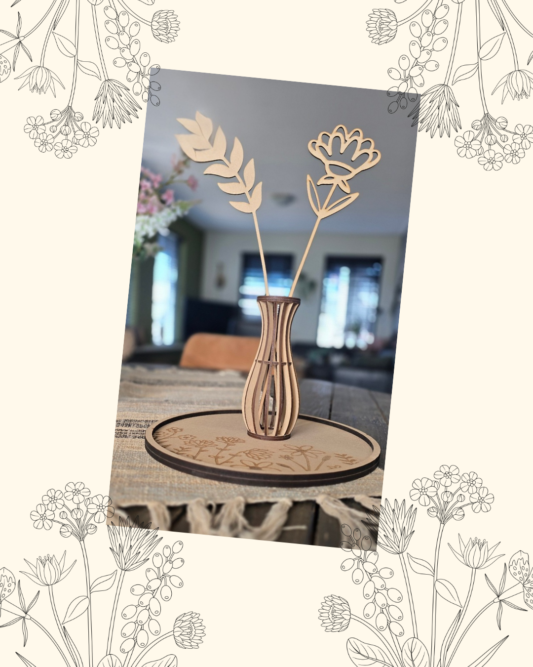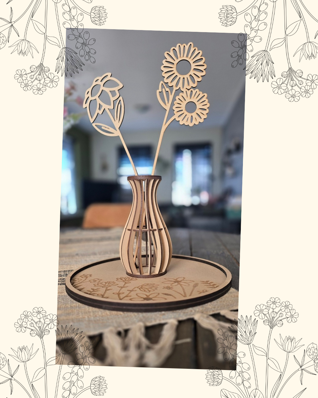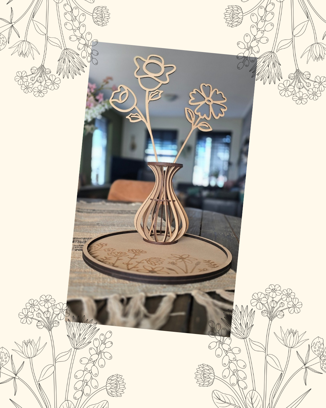 Met deze leuke set ben je in één keer klaar! Een onderbord met gravure, drie vaasjes en zes bloemen.